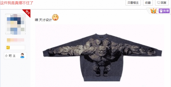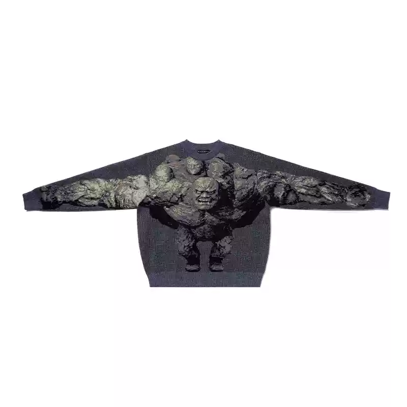 其中有一款“石敢当毛衣”遭到了很多玩家的吐槽,这件毛衣售价为328元,虽采用多色提花工艺,以芝麻点肌理,搭配牛仔色纱线,正面及背面以无量蝠奋战身形提花,看上去质感极佳,但整体呈现效果却不尽人意。